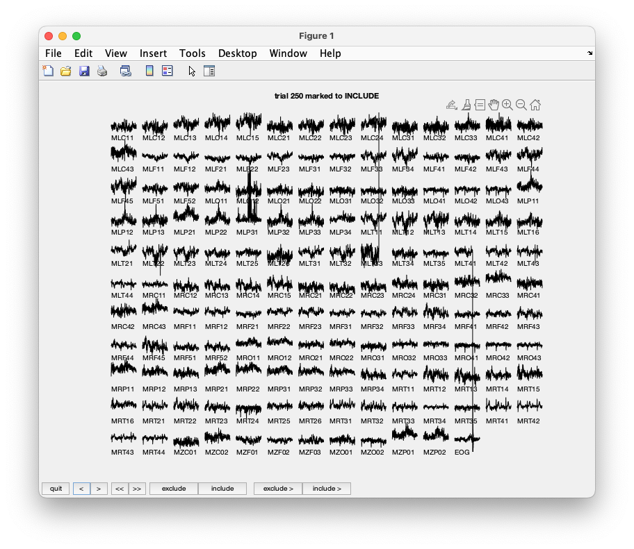 通过浏览,在试次 2、5、6、8、9、10、12、39、43、46、49、52、58、84、102、107、114、115、116、119、121、 123、126、127、128、132、133、137、143、144、147、149、158、181、229、230、233、241、243、245、250、254、260。它们应标记为 “bad”。按下 “quit” 按钮后,标记为 “bad” 的试次现在已从数据结构中删除。